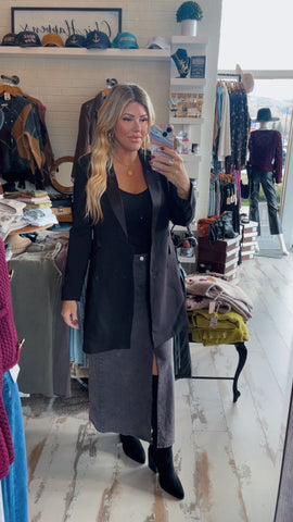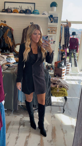 This double breasted tuxedo style blazer with satin collar is a must for every Fashionista.