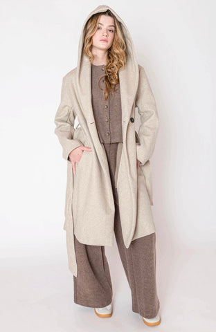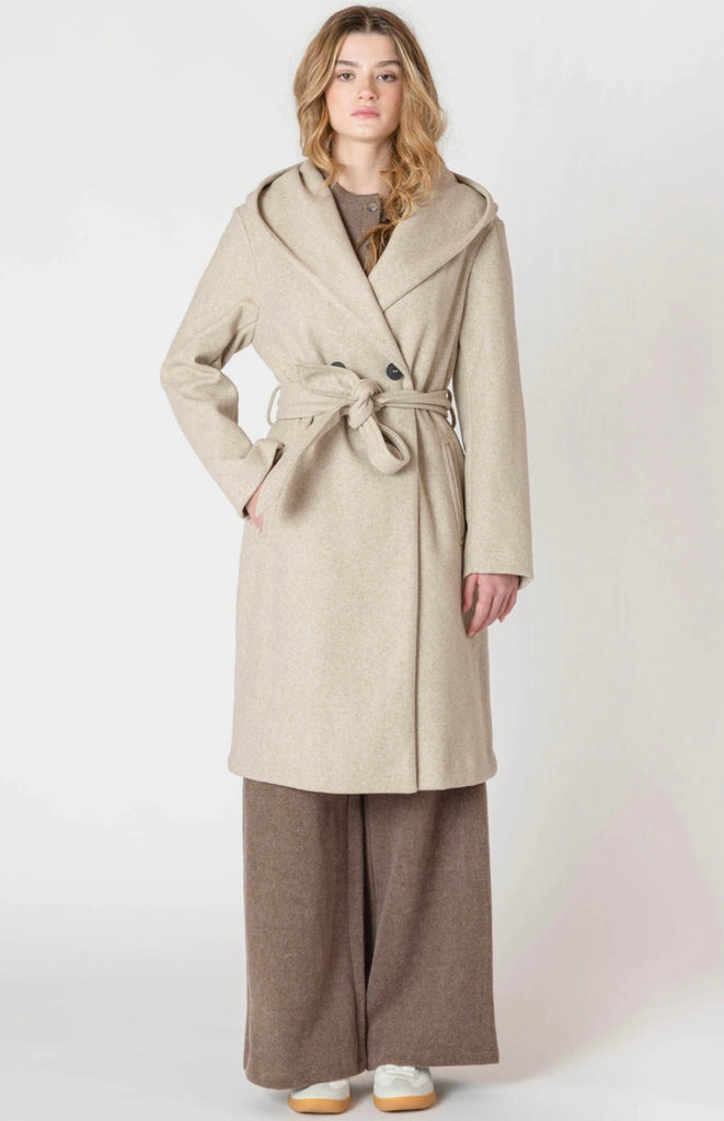 This mid length double breasted wrap coat with wide hood and belt detail is the perfect coat for the season.
