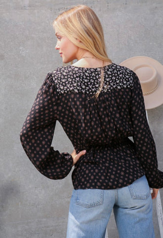 This long sleeve button down top with tie front detail is the perfect addition to any Fall wardrobe.