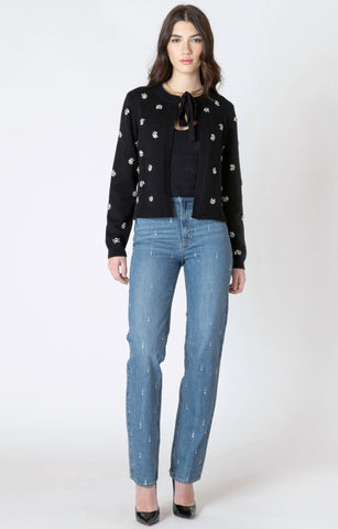 This tie front cardigan is adorned with rhinestones in a flower pattern for max style and the perfect addition for your Holiday parties.