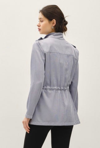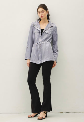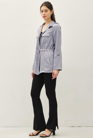 This optional 3/4 sleeve utility jacket features a tie waist zip snap closure and patch front pocket detail for max style.