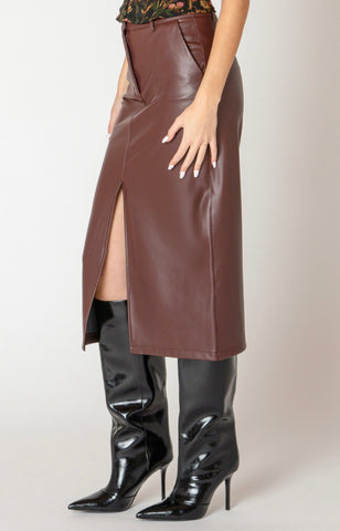 This vegan leather midi skirt with front slit is a must for every Fall wardrobe. This skirt is sure to turn heads.