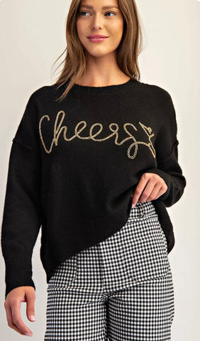 This long sleeve oversized sweater with gold “Cheers” beading is the perfect piece for any Holiday.