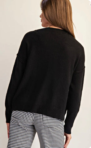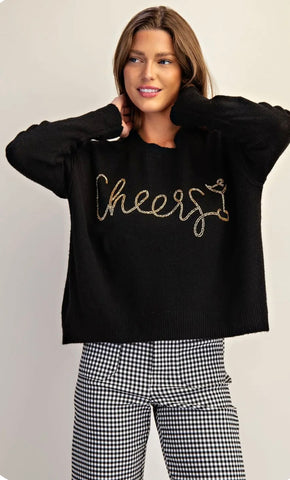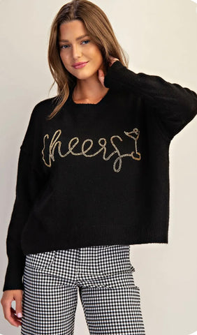 This long sleeve Crewneck sweater with “Cheers” gold beaded embroidery is perfect for every Holiday wardrobe.