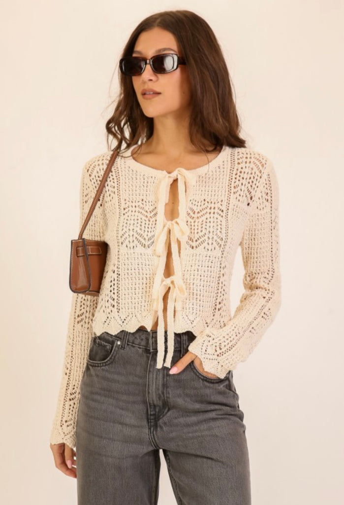 This bell sleeve crochet cardigan with tie front detail is a must for every Spring/Summer wardrobe. Wear over a cami or sleeveless dress for an added layer.