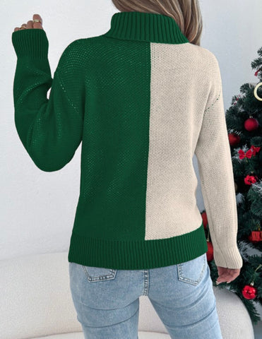 This long sleeve turtleneck color block mirror image Reindeer sweater is the perfect addition to every Winter/Holiday wardrobe.