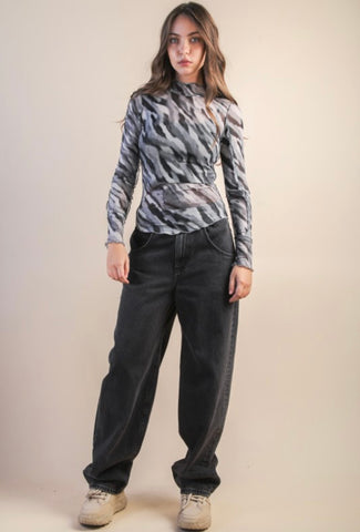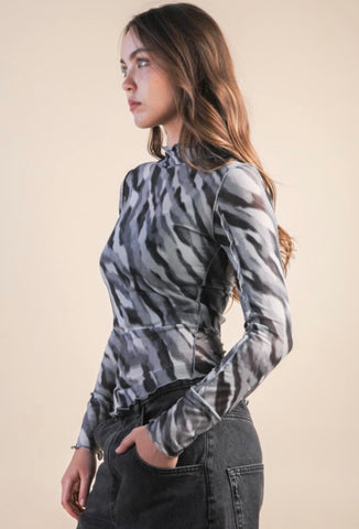 This long sleeve sheer mock neck zebra print top features exposed seams and rounded hemline for max style and comfort.