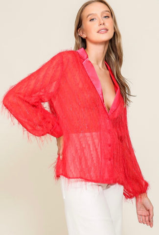 This long sleeve button down sheer blouse with plunging neckline and satin collar and cuffs features fringe and glitter for an elegant look.