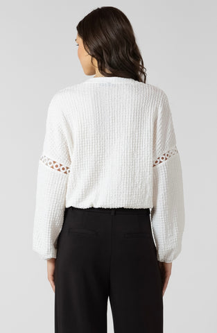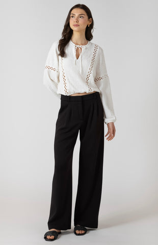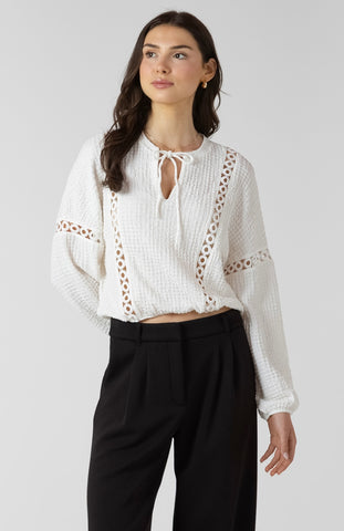 This balloon sleeve textured peasant top with optional tie front detail is a must for every Spring/Summer wardrobe.