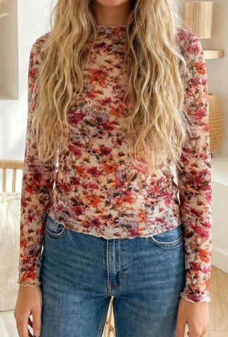 This long sleeve floral sheer mesh top with mock neck is the perfect addition to your Spring/Summer wardrobe.