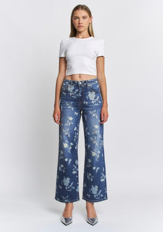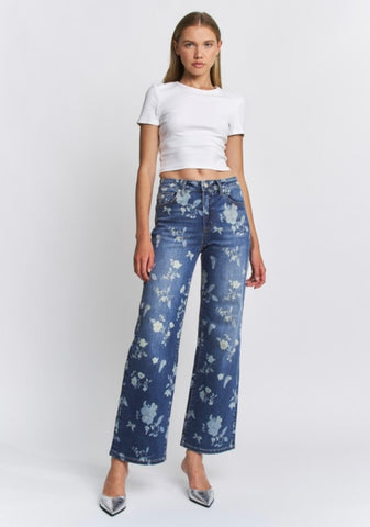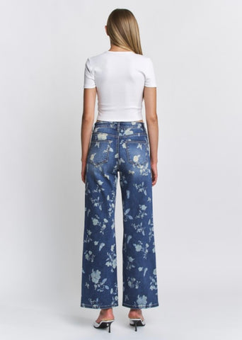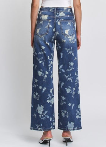 These wide leg high rise jeans with floral printed detail are the perfect addition to your spring wardrobe. Sure to turn heads in this unique style.