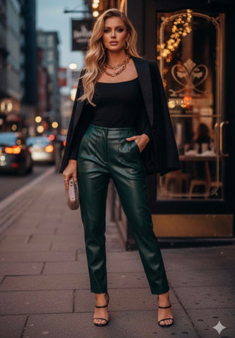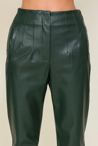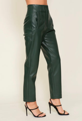 These vegan leather high rise trouser pants feature a cropped hem and pintuck front detail with zip and hook button closure. A must for your Holiday parties.