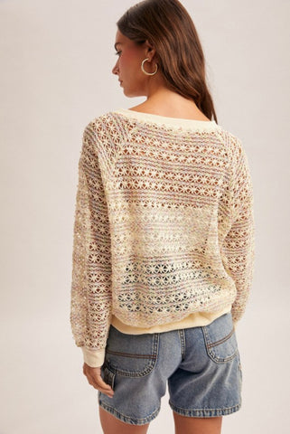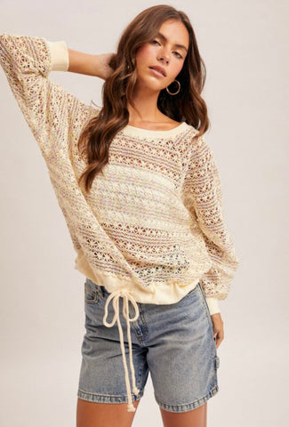 This long sleeve crochet sweater with tie hem is a must for every Spring/Summer wardrobe.