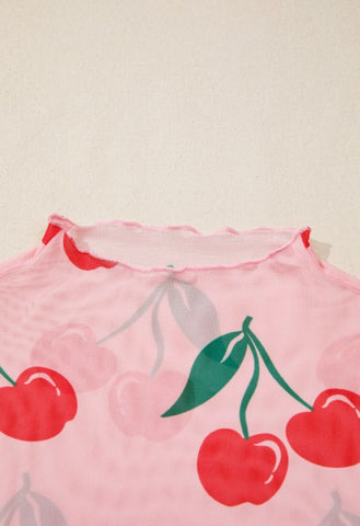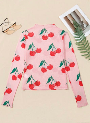 This long sleeve sheer mesh cherry print top features a mock neck with lettuce hem for max style.